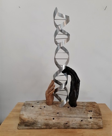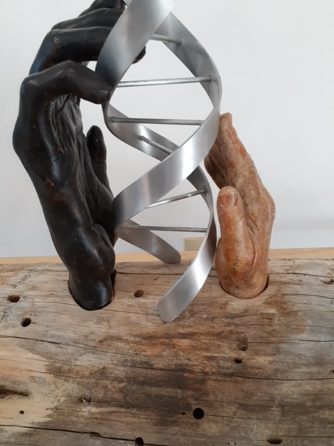 This is a tribute to Charles Darwin. Two hands are embracing their shared ancestry, the DNA double helix. One is the hand of a Bonobo monkey, the other is a human hand. They are growing out of a base of insect infested wood.